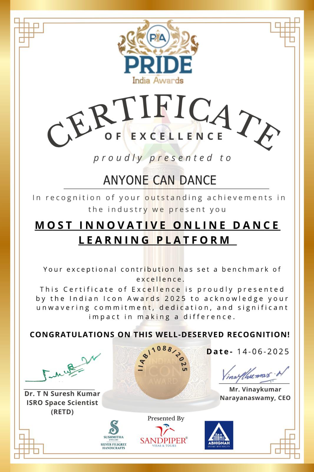 "Most Innovative Online Dance Learning Platform 2025" - Recognized for breaking barriers and making dance accessible to everyone, regardless of age, background, or skill level.